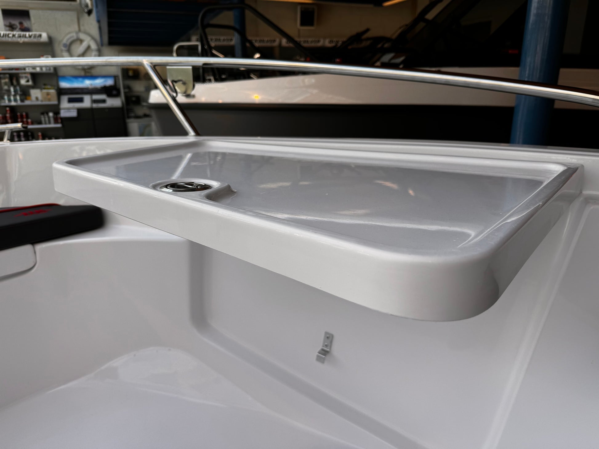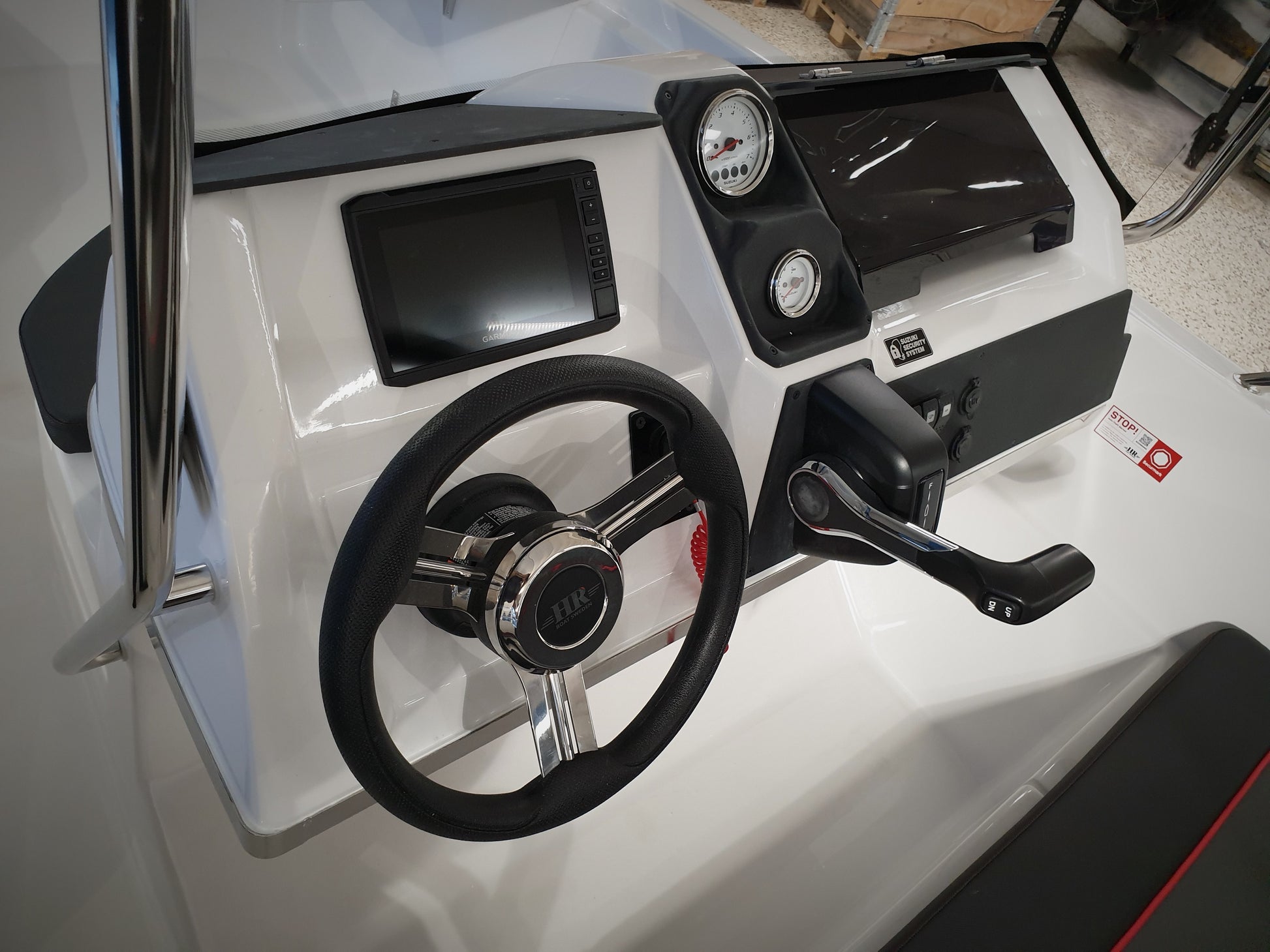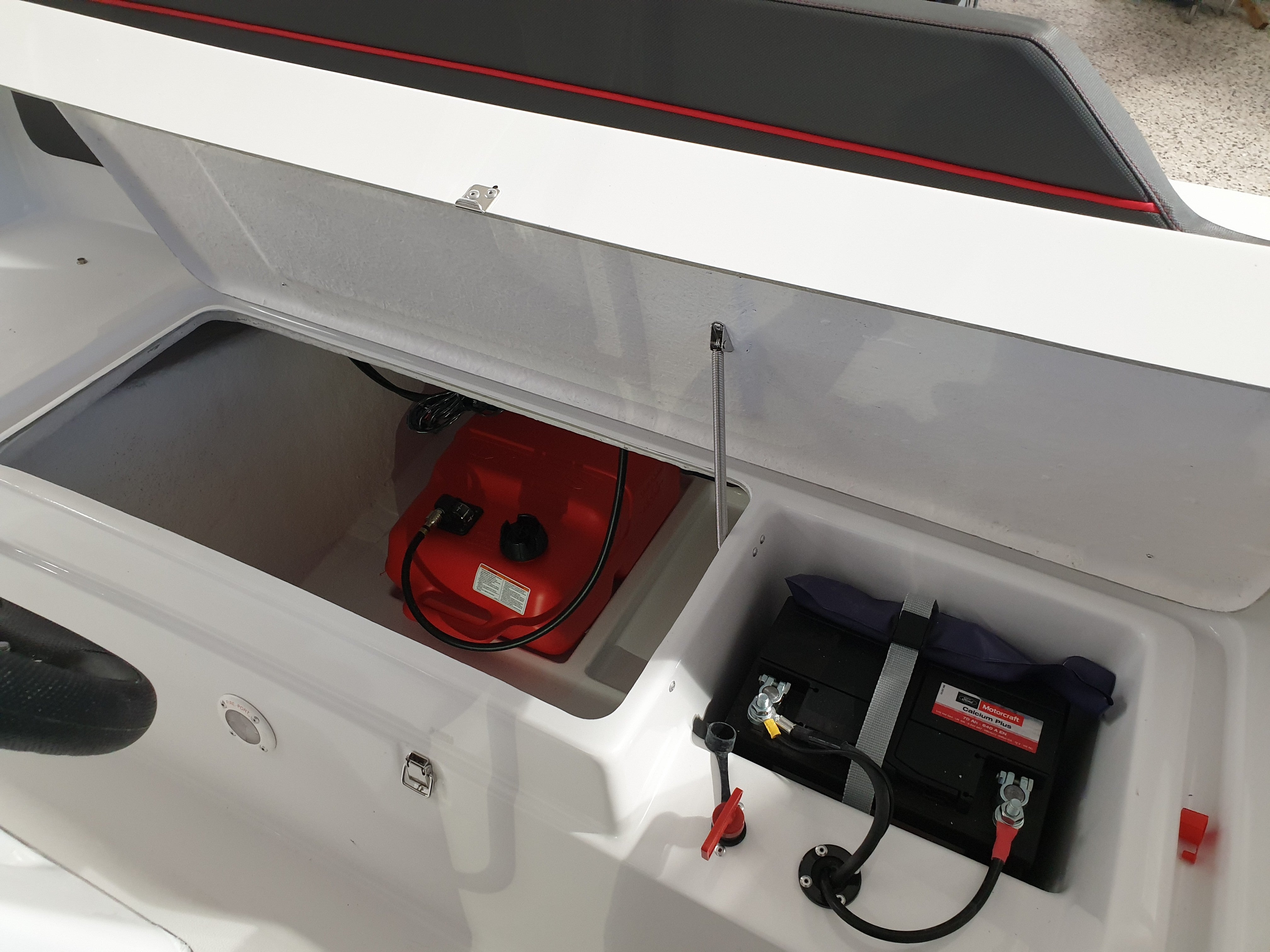 Dette er en solid, god båt som du vil oppleve at går stødig og trygt på vannet, og som har gode og funksjonable løsninger. Godt med stuverom under alle sitteplasser og i selve styrekonsollen. Et funksjonelt og fint dashboard - hvor vi har montert Garmin UHD72CV kartplotter. Det er også inkludert svinger. Et godt hanskerom og dobbelt USB-uttak og instrumenter har også plass i konsollen. Den har en praktisk løsning med bord som kan felles opp og som også står trygt og sikkert når det er nedfelt. Ønsker du en ekstra bensintank, så er det forberedt plass til dette.