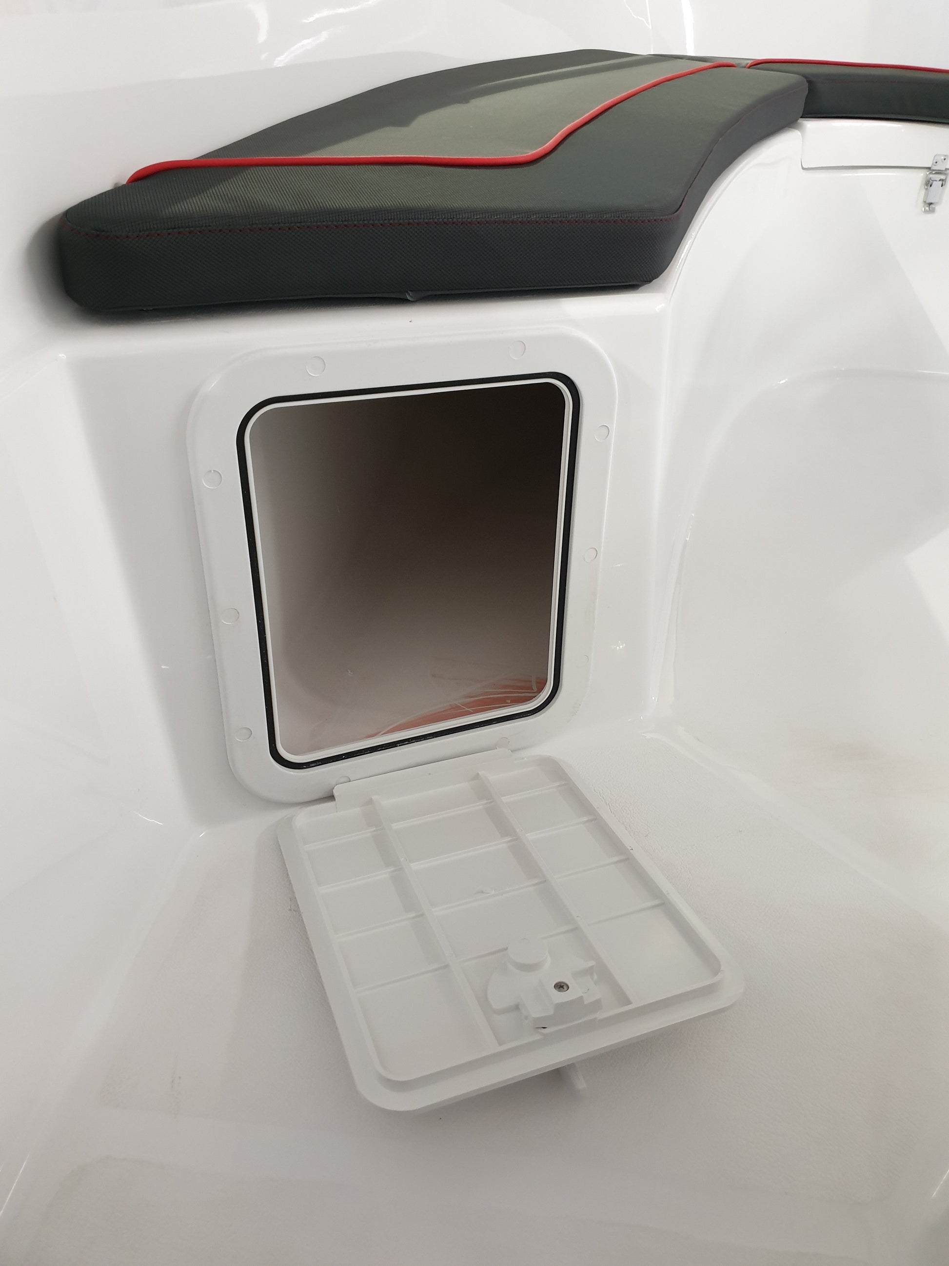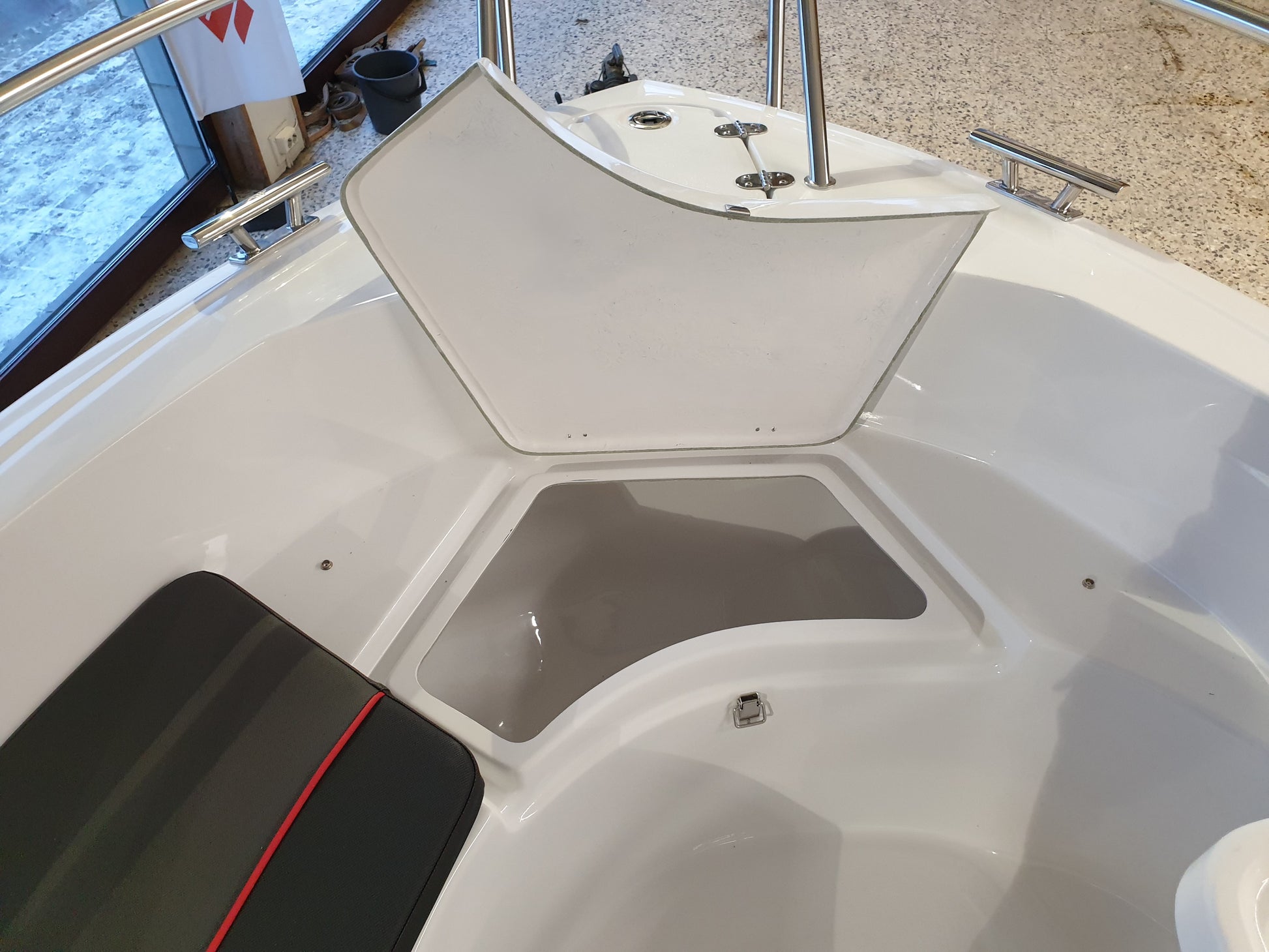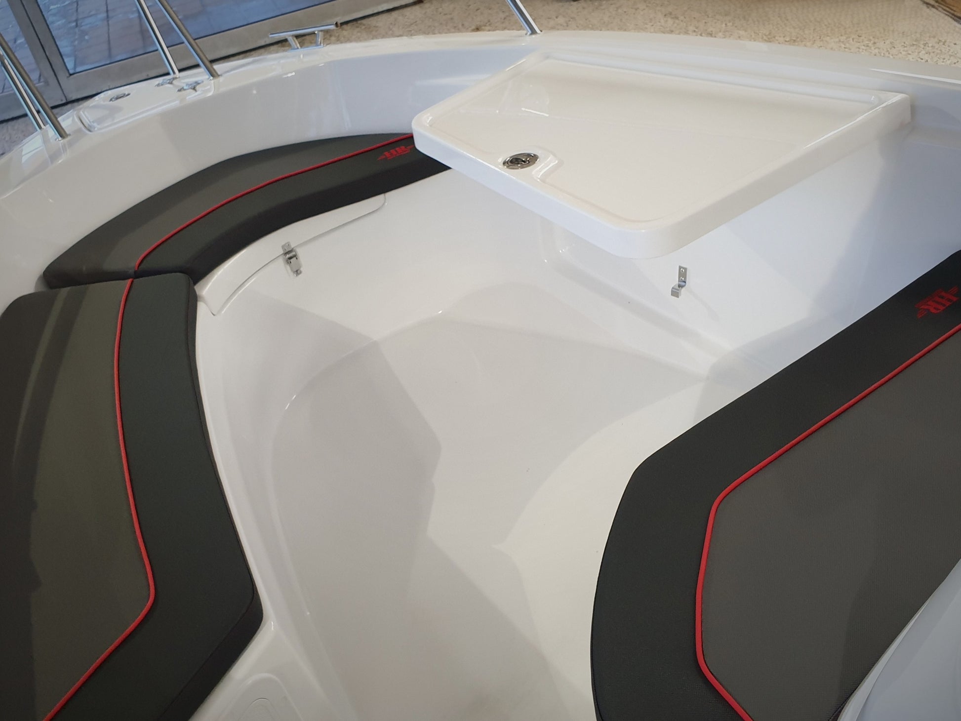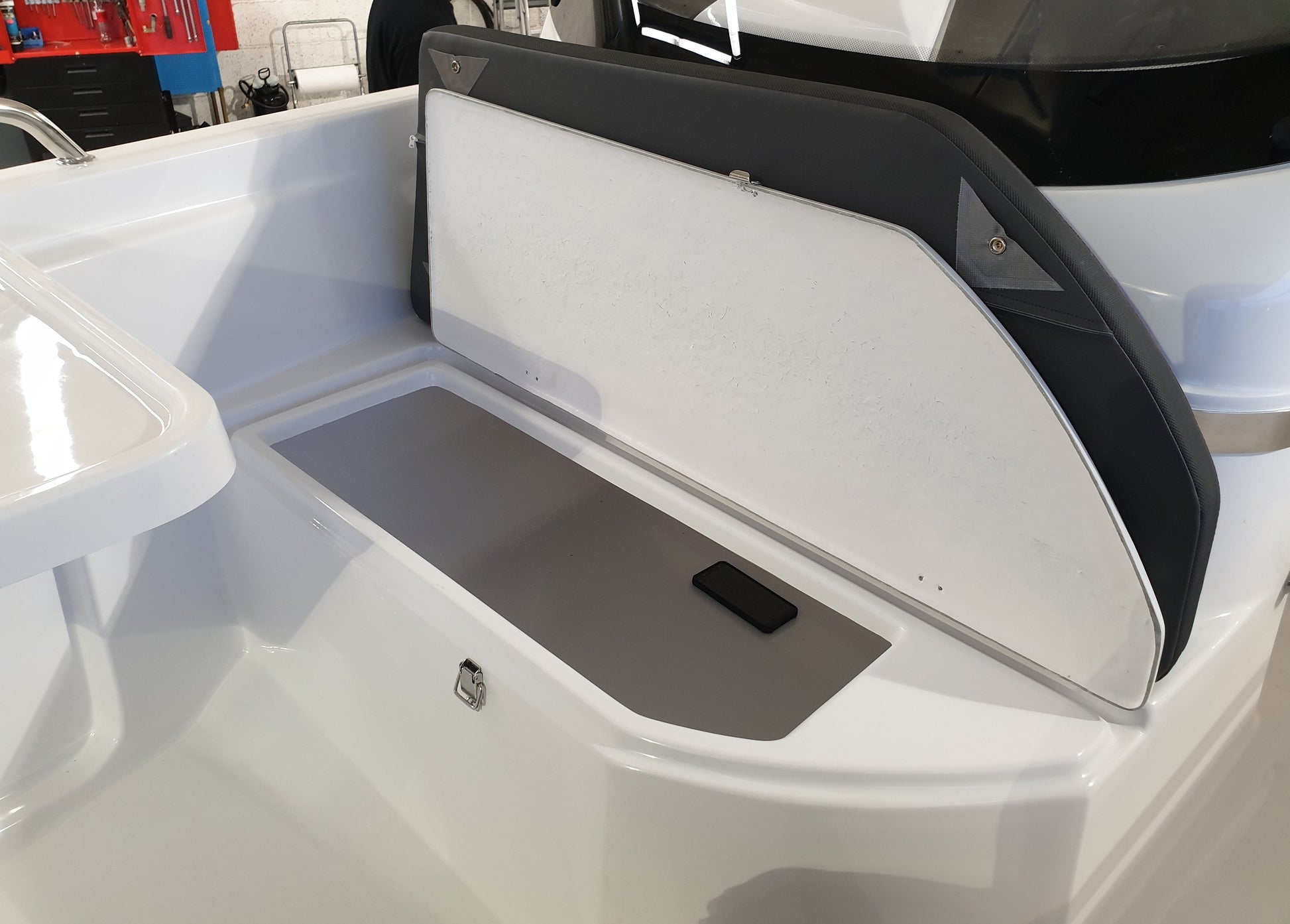 Dette er en solid, god båt som du vil oppleve at går stødig og trygt på vannet, og som har gode og funksjonable løsninger. Godt med stuverom under alle sitteplasser og i selve styrekonsollen. Et funksjonelt og fint dashboard - hvor vi har montert Garmin UHD72CV kartplotter. Det er også inkludert svinger. Et godt hanskerom og dobbelt USB-uttak og instrumenter har også plass i konsollen. Den har en praktisk løsning med bord som kan felles opp og som også står trygt og sikkert når det er nedfelt. Ønsker du en ekstra bensintank, så er det forberedt plass til dette.